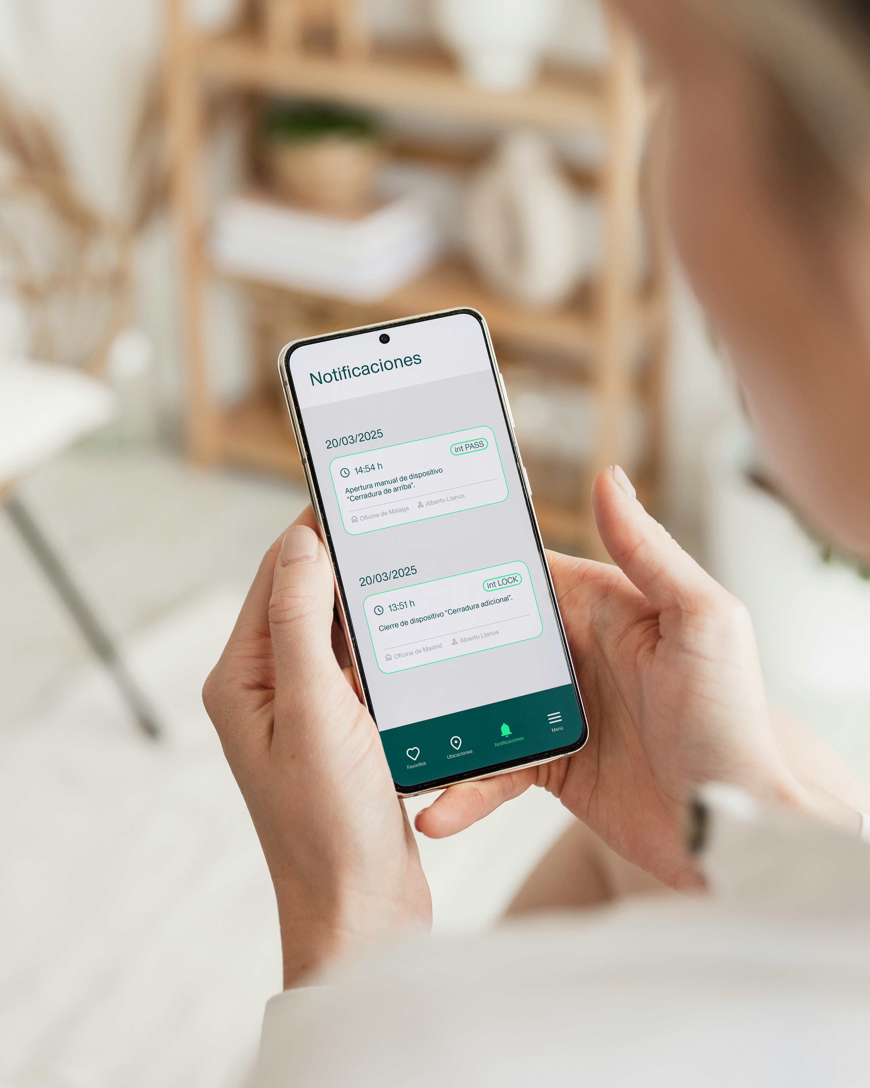 Recibe alertas en tiempo real sobre cualquier movimiento que sufra la cerradura. Ya sean estados de la puerta, intentos de intrusión, etc.
